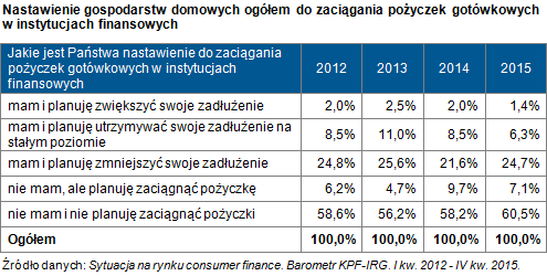 Analiza danych wskazuje na rosnącą skalę konserwatywnego podejścia do zaciągania zobowiązań w postaci pożyczek i kredytów gotówkowych w instytucjach finansowych. Ponad 60% ogółu gospodarstw domowych nie planuje zaciągać pożyczki gotówkowej – udział takich gospodarstw w analizowanym okresie wzrósł o prawie 2 pp.. Jednocześnie prawie co czwarte gospodarstwo domowe deklaruje chęć zmniejszenia posiadanych zobowiązań tego rodzaju i względny udział takich właśnie uczestników rynku kredytowego utrzymuje się w latach 2012 – 2015 na względnie stałym poziomie. Maleje również grupa gospodarstw domowych, zainteresowana utrzymaniem swojego zadłużenia na dotychczasowym poziomie.