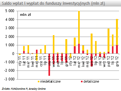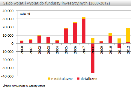 W całym 2012 r. bilans sprzedaży funduszy był także dodatni i wyniósł ponad +19 mld zł. Najwięcej środków napłynęło do funduszy niedetalicznych, +17,2 mld zł, przede wszystkim skupionych w 3 TFI. W sumie ponad +8 mld zł wpłacono do kilku funduszy PZU TFI utworzonych na potrzeby grupy, ponad +3 mld zł do kilku funduszy Copernicus Capital TFI oraz ponad +4,5 mld zł do funduszy ze Skarbiec TFI.