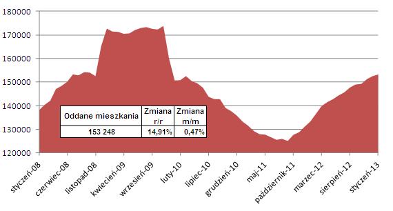 Jedyne czego wciąż przybywa, to lokale oddawane do użytkowania. W ostatnich 12 miesiącach ich łączna liczba wyniosła 153,2 tys. czyli o 14,9 proc. więcej niż przed rokiem. To najwięcej od grudnia 2009 roku. Mieszkań przeznaczonych na sprzedaż oddano w tym czasie przeszło 64,2 tys., o 26,9 proc. więcej niż rok wcześniej, a przy okazji najwięcej od kwietnia 2010 roku.