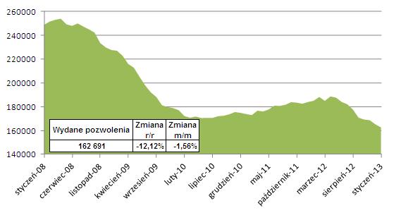 W przypadku liczby wydawanych pozwoleń na budowę sytuacja przedstawia się podobnie. Łączna liczba mieszkań, na których budowę pozwolenia otrzymali wszyscy uczestnicy rynku (głównie deweloperzy i inwestorzy indywidualni) w ostatnich 12 miesiącach łącznie sięgnęła blisko 162,7 tys., czyli o 12,12 proc. mniej niż w analogicznym okresie rok wcześniej. Tak samo jak w przypadku liczby rozpoczynanych budów, jest to najmniej w ciągu ostatnich pięciu lat. Sami deweloperzy wystarali się w omawianym okresie o 70,3 tys. pozwoleń, o 12,9 tys. (15,5 proc.) mniej niż rok wcześniej. Również pod tym względem styczeń 2013 roku był dla nich najsłabszym miesiącem od co najmniej pięciu lat. Uzyskali bowiem pozwolenia na budowę 3347 lokali – o 38,7 proc. mniej niż w styczniu 2011 roku. Dotychczas z najsłabszym otwarciem roku mieliśmy do czynienia w styczniu 2010 roku, kiedy wydane deweloperom pozwolenia na budowę dotyczyły 3856 mieszkań.