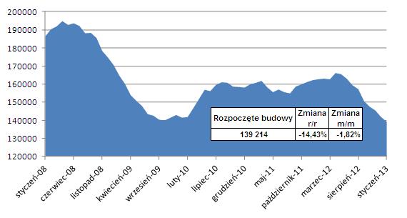 Z początkiem nowego roku z rynku budownictwa mieszkaniowego napłynęły fatalne dane. Uzasadnione będzie nawet użycia słowa zapaść, szczególnie w odniesieniu do liczby rozpoczynanych inwestycji oraz wydawanych pozwoleń na budowę. W ostatnich 12 miesiącach w sumie rozpoczęto budowę 139,2 tys. domów i mieszkań (najmniej w ostatnich pięciu latach), a to oznacza roczną dynamikę na poziomie minus 14,4 proc. W segmencie mieszkań przeznaczonych na sprzedaż spadek sięgnął 14,3 proc., a suma lokali, których budowę rozpoczęto wyniosła 55,6 tys. – najmniej od kwietnia 2010 roku.