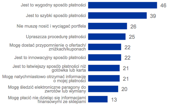 Konsumenci doceniają wygodę i prostotę aplikacji służących do dokonywania płatności mobilnych. Największą zaletą płacenia przez aplikację jest ich zdaniem wygoda (stwierdziło tak 46% respondentów), 39% wybiera szybkość, a dla 26% największą wygodą jest brak konieczności noszenia ze sobą fizycznego portfela. Innymi atrybutami aplikacji postrzeganymi jako zalety są: możliwość przypomnienia o zniżkach i kuponach (opcja wybrana przez 22% użytkowników smartfonów lub tabletów), otrzymywanie natychmiastowego potwierdzenia płatności (21%) oraz trzymania w jednym miejscu wszystkich dowodów zakupu, niezbędnych do ewentualnych zwrotów (20%). Nie powinniśmy się więc dziwić, że siłą napędową handlu mobilnego są młodzi dorośli: 59% globalnych zakupowiczów mobilnych ma od 18 do 34 lat. W przypadku wszystkich nabywców online stanowią oni 44%.