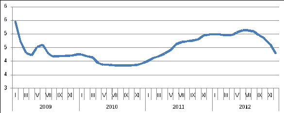Średniomiesięczna stawka WIBOR 3M w okresie I 2009-XII 2012