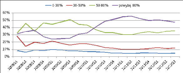 Choć Rodzina na Swoim znika już z rynku, to pozostałe czynniki wpływające na strukturę LtV nadal będą istnieć, nie oczekujemy więc w 2013 r. nagłej zmiany i powrotu do sytuacji z lat 2008-2009. Prognozujemy jednak, że udział kredytów z wkładem własnym nie większym niż 80 proc. spadnie w najbliższych 12 miesiącach z obecnych niecałych 50 proc. (47,24 proc. w III kw. 2012 r.) do około 40-42 proc. – oprócz wygaśnięcia programu Rodzina na Swoim, stać za tym będzie dalsza zmiana podejścia banków, które jeszcze zwiększą ostrożność przy udzielaniu kredytów.