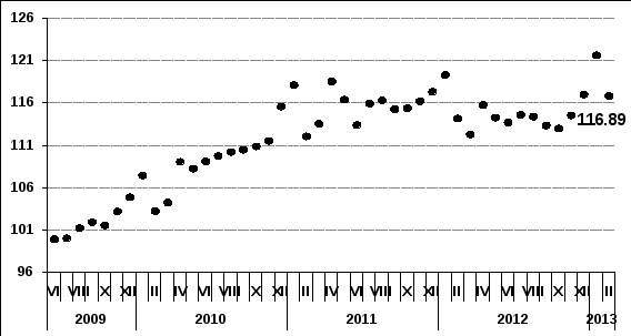 Miesięczny spadek indeksu to zachowanie zgodne z oczekiwaniem – pod koniec roku następuje sezonowy wzrost średniego wynagrodzenia (związany z wypłacaniem premii na koniec roku) ogłaszanego przez Główny Urząd Statystyczny, rośnie więc i indeks, bo jest wyliczany na podstawie przeciętnych zarobków Polaków. Potem średnia pensja spada i indeks wraz z nią. Dlatego spoglądamy na niego w ujęciu rocznym, a tu odczyt indeksu wygląda dużo lepiej – rośnie o 2,32 proc.