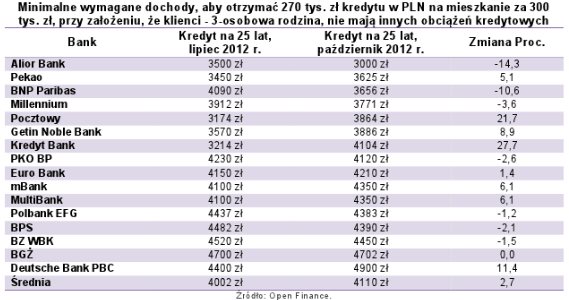 Kolejny bank zdecydował się jednak na przeciwny ruch i mocno podwyższył wymagania. O ponad 20 proc. większe dochody niż w lipcu należy mieć w Banku Pocztowym (3864 zł), który do tej pory zazwyczaj był zwycięzcą zestawienia. Na prawie 9-proc. podwyżkę progu zdecydował się również Getin Noble Bank. Trzy miesiące temu był piąty, teraz jest szósty i na otrzymanie opisywanego kredytu potrzeba tu prawie 3900 zł. Na tym banku kończy się lista instytucji gotowych udzielić 270 tys. zł kredytu opisywanej rodzinie, jeśli ma mniej niż 4 tys. zł dochodów netto.