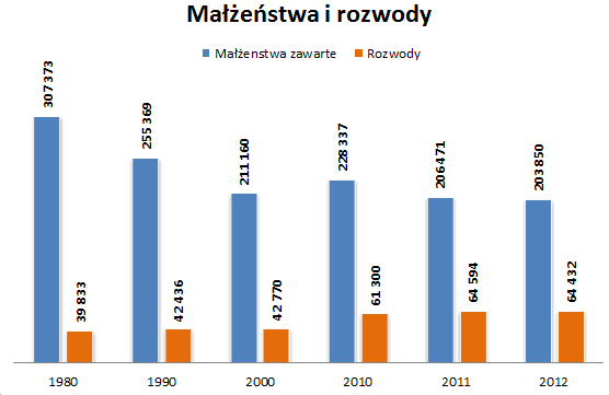 Coraz mniej Polaków decyduje się małżeństwo, natomiast coraz więcej na rozwód. Jak wynika z Rocznika Demograficznego GUS-u w Polsce w 1980 r. zawarto 307 373 małżeństw i przeprowadzono 39 833 rozwodów. Dla porównania w 2012 r. zawarto 203 850 małżeństw (czyli o ponad 100 tys. mniej niż 30 lat temu) i przeprowadzono aż 64 432 rozwodów (niemal dwa razy więcej). Oznacza to, że w 2012 roku na każde 1000 małżeństw rozpadło się 316.