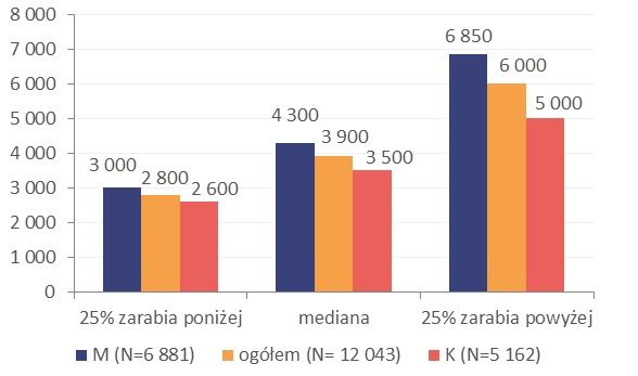 Także i w tej grupie mężczyźni zarabiali więcej od kobiet. Mediana wynagrodzeń panów po 50. roku życia wyniosła 4 300 PLN i była o 800 PLN wyższa niż mediana wynagrodzeń kobiet. Natomiast 25% mężczyzn zarabiało nie mniej niż 6 850 PLN, ale już 25% kobiet zarabiało przynajmniej 5 000 PLN brutto miesięcznie.