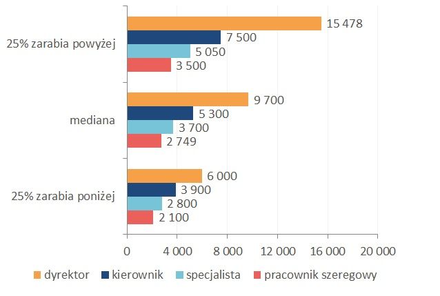 Przeciętne zarobki dyrektorów, którzy w 2015 roku mieli więcej niż 50 lat, wyniosły 9 700 PLN brutto miesięcznie. To prawie dwukrotnie więcej niż przeciętne zarobki kierowników (5 300 PLN). Specjaliści z kolei zarabiali przeciętnie 3 700 PLN brutto miesięcznie, a więc o niespełna 1 000 PLN więcej niż pracownicy najniższego szczebla (2 749 PLN).