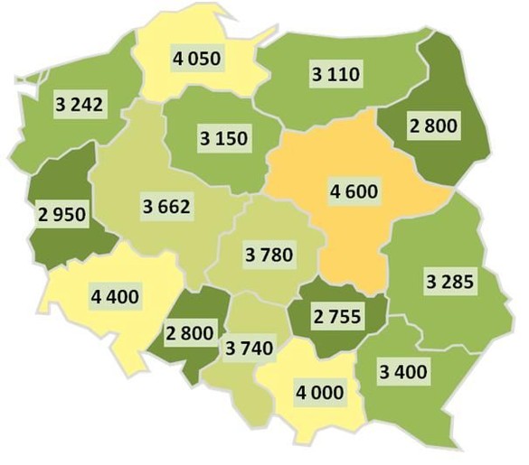 Najwyższe przeciętne wynagrodzenie otrzymywali pracownicy organizacji pozarządowych z województwa mazowieckiego – 4 600 PLN brutto miesięcznie. Wysokie mediany wynagrodzeń odnotowano również w województwach dolnośląskim (4 400 PLN), pomorskim (4 050 PLN), i małopolskim (4 000 PLN). Najniższe wynagrodzenia otrzymywali pracujący na terenie województwa świętokrzyskiego, mediana pensji wyniosła 2 755 PLN brutto. Przeciętne pensje, nie przekraczające 3 000 PLN odnotowano w województwach opolskim (2 800 PLN), podlaskim (2 800 PLN) i lubuskim (2 950).