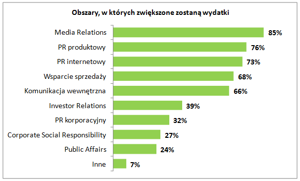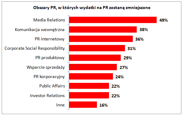W przypadku obszarów gdzie wydatki zostaną zredukowane w ramach istniejących budżetów to dotyczą one: Corporate Social Responsibility, Investor Relations i Komunikacji wewnętrznej. Natomiast cięcia w budżecie na działania PR głównie odbiją się na następujących narzędziach: Media Relations, Komunikacja wewnętrzna, czy PR produktowy.