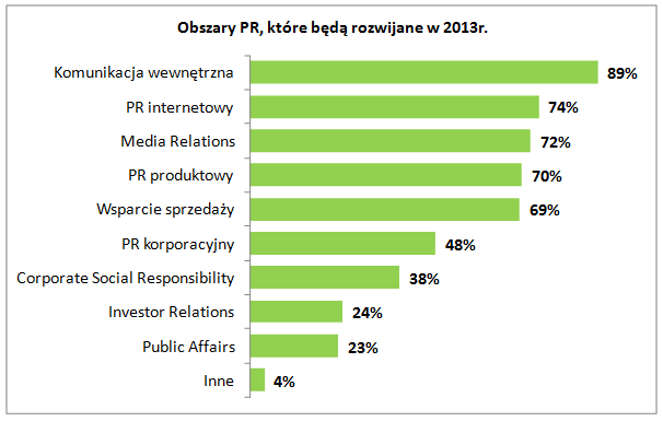 Dodatkowo badanym zadano pytanie o obszary/działania PR, które będą rozwijane w 2013 r.. Oczywiście w domyśle chodzi o działania w ramach zwiększonego, obecnego lub nieznacznie zmniejszonego budżetu. Tutaj zdecydowanie dominuje komunikacja wewnętrzna, a następnie działania w Internecie czy Media Relations.