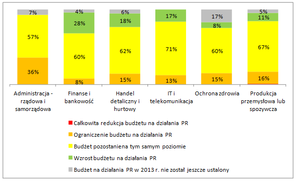 Zdecydowana większość (od 57% do 71% w zależności od sektora) badanych firm planuje utrzymać wydatki na PR w 2013r. na poziomie z 2012r. Największy odsetek planujących wzrosty wydatków został odnotowany w Finansach i bankowości (28%) i w handlu (18%). Największy odsetek planujących redukcje budżetów PR występuje w Administracji.