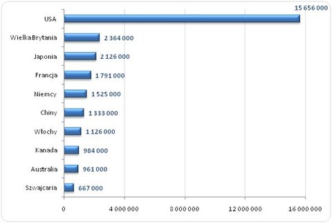 W pierwszej dziesiątce znalazły się kraje z najbardziej rozwiniętą gospodarką. Pierwsze miejsce w zestawieniu zajęły Stany Zjednoczone z liczbą 15 656 000 milionerów. To prawie osiem razy więcej niż liczba milionerów w kraju z drugiego miejsca – Wielkiej Brytanii. Ostatnie miejsce na podium zajęła Japonia z bardzo zbliżonym wynikiem do obywateli Zjednoczonego Królestwa.