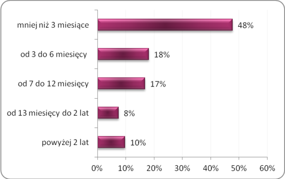 Od 3 miesięcy do roku poszukiwanie pracy zajęło ponad 1/3 ankietowanych (35%). Jedynie 8% respondentów szukało pracy od 13 miesięcy do 2 lat, zaś powyżej 2 lat pracy szukała co 10 przebadana osoba.