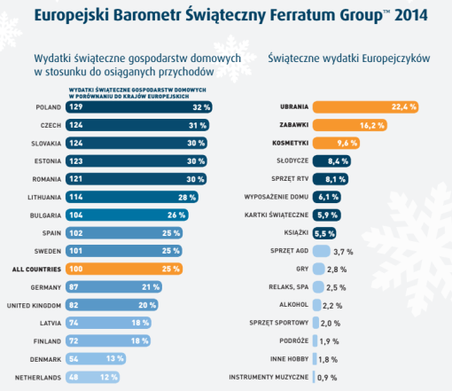 Wyniki Europejskiego Barometru Świątecznego pokazują, że w większości krajów europejskich, ludzie wydadzą podobną ilość pieniędzy, jak w zeszłym roku. Co ciekawe, biorąc pod uwagę poziom dochodu gospodarstw domowych w Europie Środkowej i Wschodniej, znacznie więcej pieniędzy wydaje się na świąteczne zakupy w tych krajach niż w innych częściach Europy. Badanie Ferratum Group obejmowało analizę relacji konsumpcji na gospodarstwo domowe w stosunku do osiąganych przychodów. Index Ferratum dla Polski wynosi 129, co oznacza, że jest o 29 punktów wyższy w porównaniu do średniej ze wszystkich zbadanych krajów (100). Polacy na Boże Narodzenie wydają prawie jedną trzecią swojego miesięcznego dochodu (32%). Dla porównania Hiszpanie wydają 25% dochodu (indeks 102), Niemcy 21% (indeks 87) a Holendrzy 12% (indeks 48).