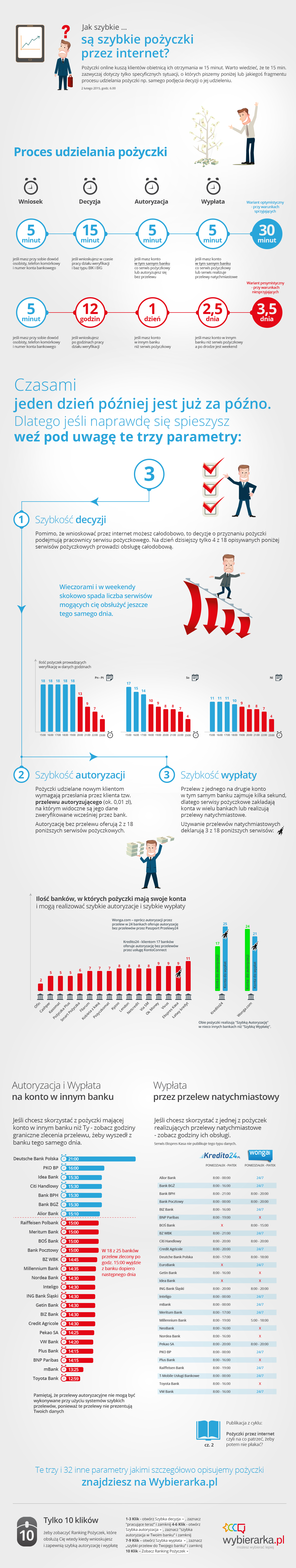 Proces udzielania pożyczki można podzielić na cztery etapy – wniosek, decyzja o przyznaniu pożyczki, autoryzacja danych klienta i ostatni, czyli wypłata pieniędzy. O ile złożenie wniosku w internecie może zająć około pięciu minut, o tyle czas potrzebny na każdy z trzech kolejnych etapów może się wahać od 5 minut aż do 2,5 dnia przy niesprzyjających okolicznościach (patrz infografika).
