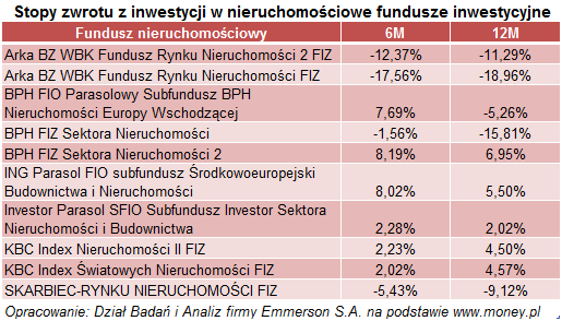 O ile zalety pośrednich inwestycji są już dobrze znane polskiemu inwestorowi, o tyle opłacalność inwestycji pozostawiała w ostatnim czasie wiele do życzenia. W poniższej tabeli zaprezentowano odpowiednio półroczne i roczne stopy zwrotu z inwestycji w nieruchomościowe fundusze inwestycyjne. Mniej więcej co drugi z nich zakończył rok pod kreską.