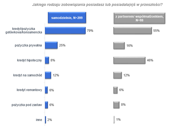 Jak pokazują badania, Polacy częściej korzystają z kredytów/pożyczek gotówkowych niż z innych rodzajów finansowania, w szczególności wtedy, gdy były one zaciągnięte samodzielnie (76%). Popularna jest także pożyczka prywatna (pieniądze pożyczone od rodziny, czy znajomych), której „właścicielem” jest samodzielnie co 4. osoba. Tyle samo osób zaciąga kredyt na samochód indywidualnie, ile razem ze współmałżonkiem (12% samodzielnie kredytujący zakup samochodu i również 12% – razem z partnerem).