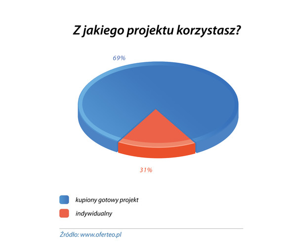Pierwszym krokiem do rozpoczęcia budowy domu jest decyzja o tym, jak budynek ma wyglądać, czyli wybór projektu. Polacy raczej rzadko decydują się na eksperymenty w tej kwestii. Tylko 31% domów będzie budowanych według indywidualnego i dedykowanego projektu – wynika z analizy zapytań składanych w Oferteo.pl. Pozostali użytkownicy wybierają kupno gotowego projektu, wśród których największą popularnością cieszą się projekty biura projektowego Archon „Dom w rododendronach” czy „Dom w idaredach”.