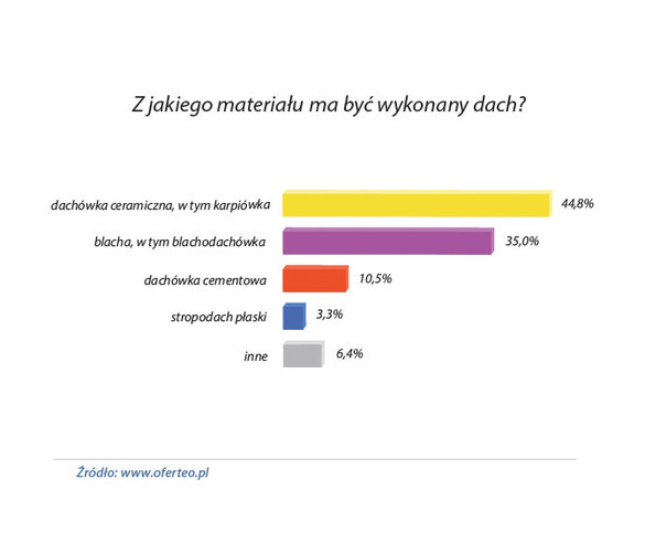 Blisko połowa (44,8%) użytkowników Oferteo.pl preferuje pokrycie swojego dachu dachówką ceramiczną, między innymi karpiówką. Co trzeci użytkownik (35%) decydował się na pokrycie dachu blachodachówką lub innymi rodzajami blachy.