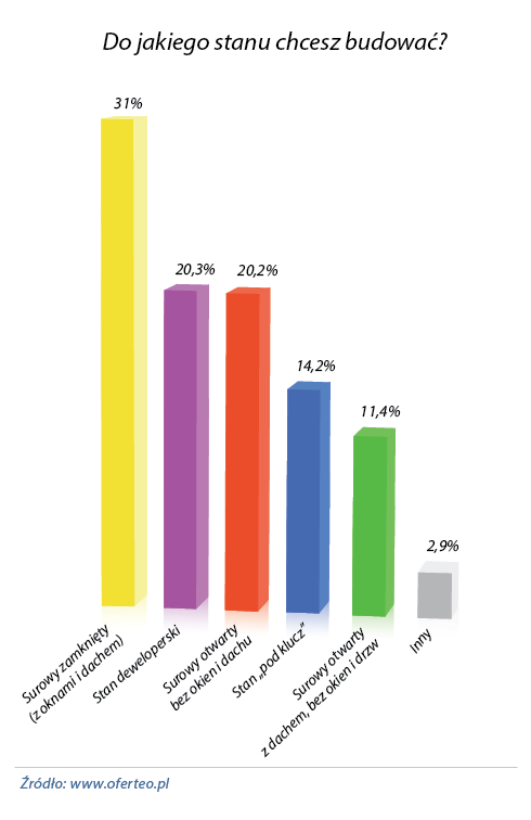 Nieco mniej osób decyduje się na odbiór domu z wykonanymi wszystkimi instalacjami (stan deweloperski). Co piąty pytający chce zlecić budowę do stanu surowego otwartego bez okien, drzwi i dachu. Użytkownicy Oferteo.pl proszą również o oferty kompleksowej budowy i wykończenia „pod klucz” (tak brzmi co siódme zapytanie).