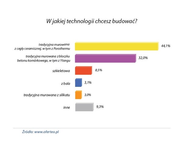 Polacy chcą budować przede wszystkim tradycyjne domy murowane z cegły ceramicznej (44,1%). W tej kategorii materiałów budowlanych najpopularniejszy jest Porotherm. Blisko co trzeci użytkownik (32%) chce zlecić budowę murowanego domu z bloczku komórkowego, przede wszystkim z Ytongu.