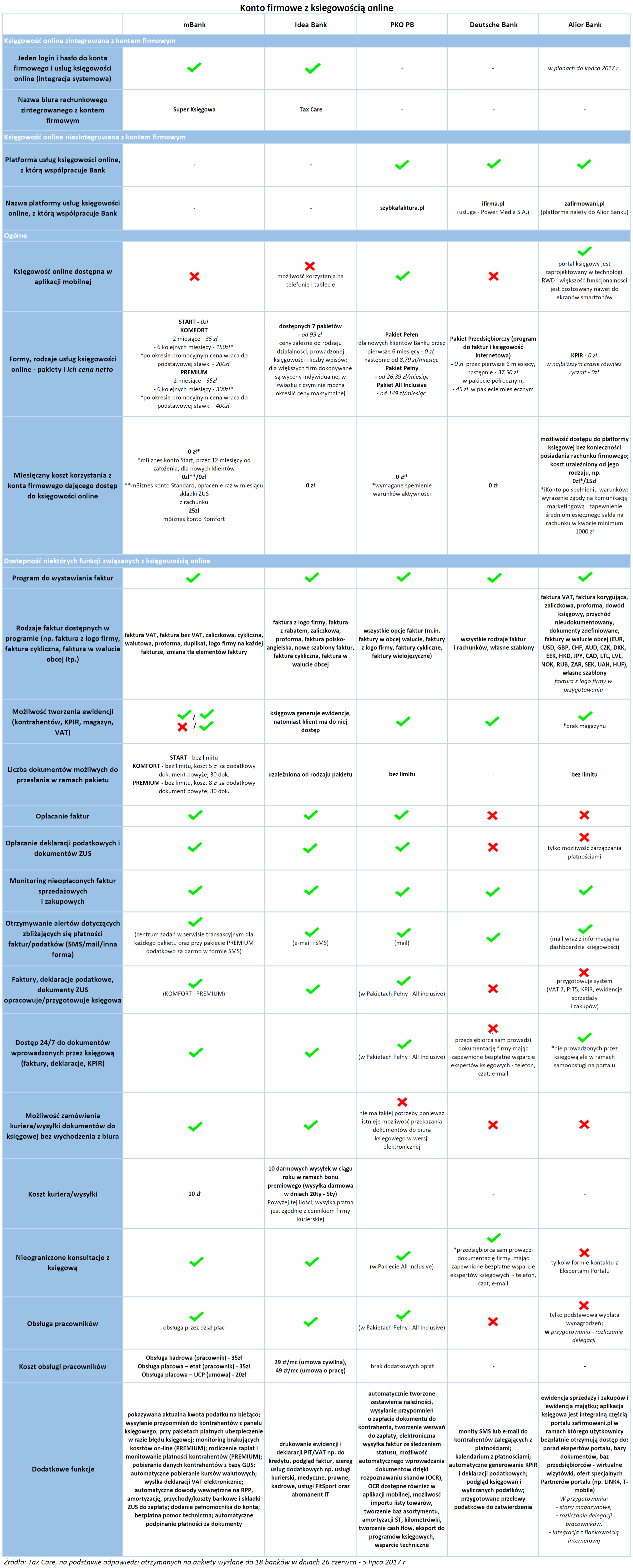 Z zestawienia Tax Care wynika, że oferty rachunków firmowych banków, które współpracują z licencjonowanymi biurami rachunkowymi, można policzyć na palcach jednej ręki – na ankietę wysłaną przez Tax Care do 18 banków odpowiedziało 5. Najwyższy poziom zautomatyzowania takiej współpracy mają mBank i Idea Bank, które bezpośrednio z poziomu internetowego konta bankowego umożliwiają mikrofirmie obsługę jej dokumentów księgowych. W pozostałej trójce znajdują się PKO BP, Deutsche Bank i Alior Bank. Naszą ankietę wypełnił też ING Bank – posiada on firmowe konto bankowe zintegrowane z usługami księgowymi online, jednak oferuje je wyłącznie przedsiębiorcom prowadzącym tzw. pełną księgowość i dlatego nie znalazł się w zestawieniu.