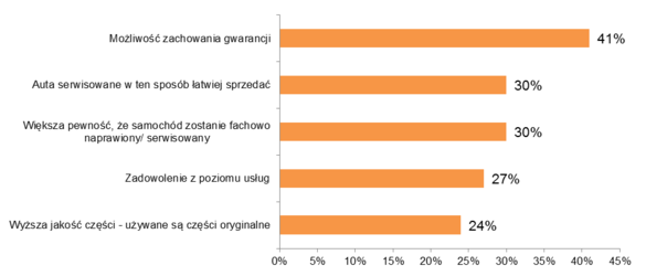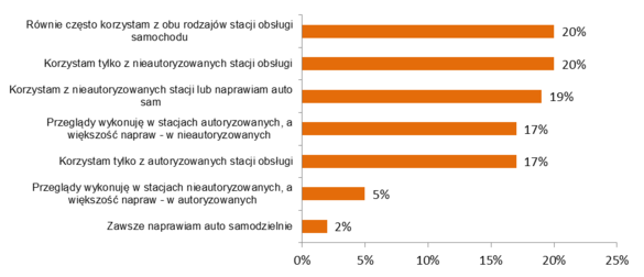 42% zmotoryzowanych korzysta z obydwu typów serwisów – autoryzowanego i nieautoryzowanego, częściowo zależnie od tego, czy ich celem jest naprawa samochodu czy przegląd. Nieliczni (2%) decydują się zawsze na samodzielną naprawę samochodu. Odsetek kierowców korzystających wyłącznie ze stacji nieautoryzowanych jest dwukrotnie wyższy niż odsetek kierowców korzystających wyłącznie z serwisów autoryzowanych. Stacje autoryzowane są najpopularniejsze wśród właścicieli samochodów marek: Skoda (30%), Opel (25%) i Toyota (25%).