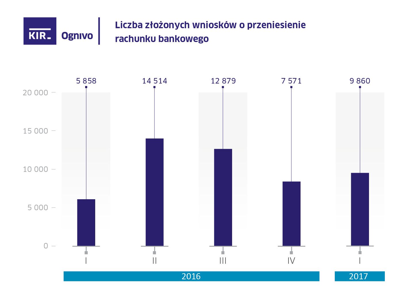 W I kw. 2017 r. decyzję o zmianie rachunku bankowego, z wykorzystaniem systemu Ognivo, podjęło 9 860 osób. W porównaniu do analogicznego okresu ubiegłego roku liczba rachunków, przeniesionych przy pomocy prowadzonego przez KIR systemu, wzrosła o ponad 68 proc. Najwięcej wniosków – ponad 4 tys. – wpłynęło w marcu.