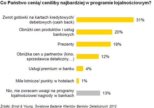 W ubiegłym roku firma Ernst & Young przeprowadziła badanie, w którym zapytała klientów banków, jaki program lojalnościowy cenią sobie najbardziej. Aż 31 proc. wskazało, że jest to moneyback (zwany też zamiennie cashbackiem). Pozycja ta zebrała w ankiecie najwięcej odpowiedzi. Kolejne miejsce zajęły rabaty, które wskazało 20 proc. respondentów.