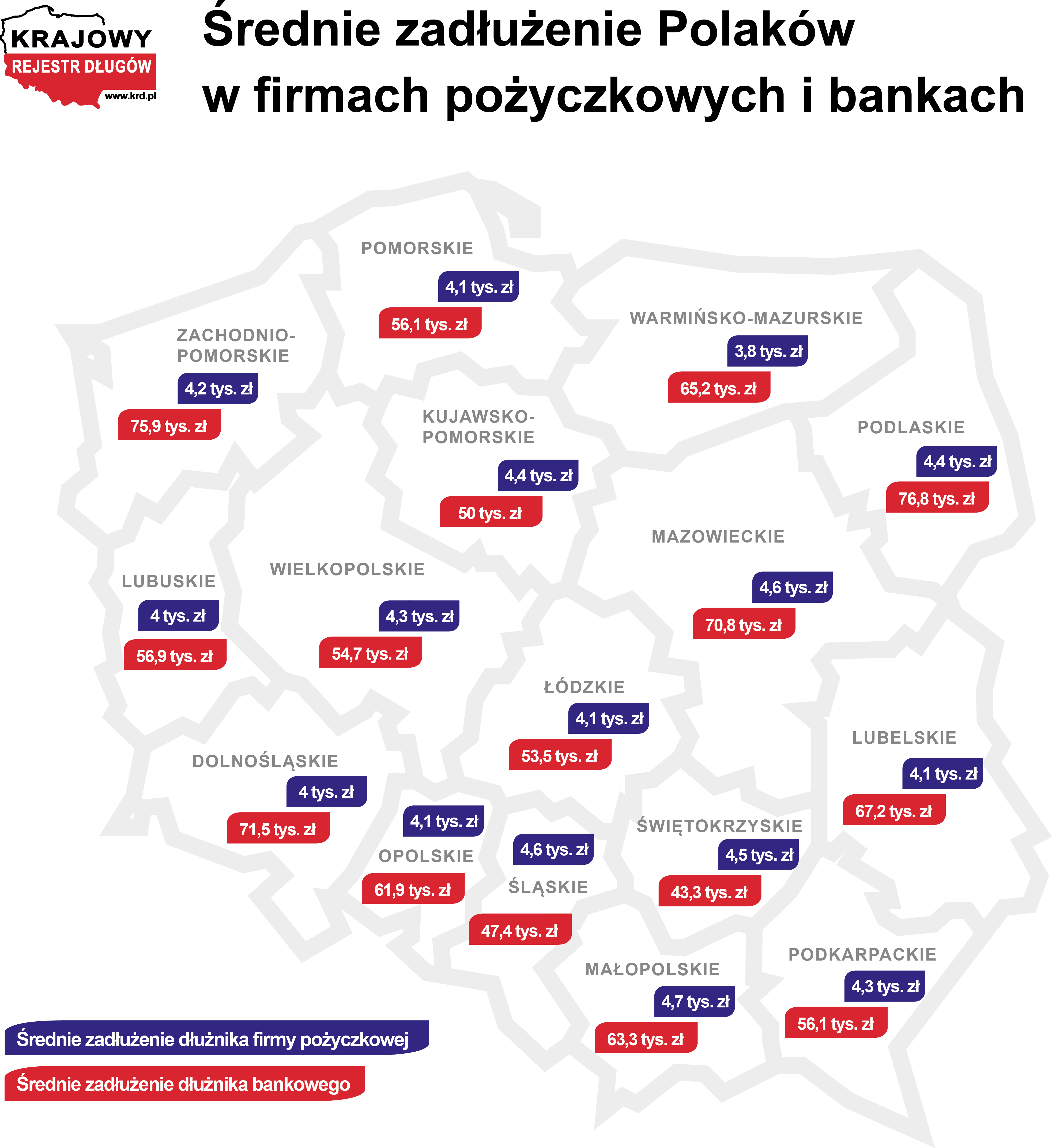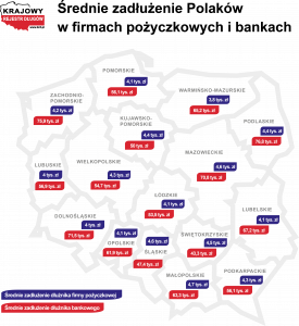 PRNews.plInformacjeKobiety mają długi w pożyczkach, a mężczyźni w bankachŚrednie zadłużenie Polaków w firmach pożyczkowych i bankach_mapa