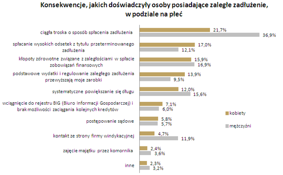 Jak wynika z badań przygotowanych przez PBS na zlecenie P.R.E.S.C.O., 17% kobiet borykających się z zaległymi długami spłaca z tego tytułu wysokie odsetki (czyli ponad 40% więcej niż mężczyzn). Kobiety nieregulujące swoich zaległości odczuwają również inne dokuczliwe utrudnienia formalno-prawne. 7,1% z nich nie ma możliwości zaciągania kolejnych kredytów w związku z wpisaniem do rejestru BIG, a 5,8% pań ma sprawę w sądzie.