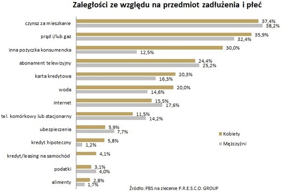 Zadłużone kobiety najczęściej zalegają ze spłatą czynszu za mieszkanie (37,4%) oraz z opłatami za prąd i/lub gaz (35,9%). Znacznie częściej niż mężczyźni mają problem ze spłatą pożyczek konsumenckich – zmaga się z nim blisko co trzecia kobieta (30%) i zaledwie co ósmy mężczyzna (12,5%). Ponadto, co piata kobieta ma zaległe zadłużenie na karcie kredytowej (20,3%). Stosunkowo często kobiety nie uiszczają również opłat za abonament telewizyjny (24,4%), rachunków za wodę (20%), internet (15,5%) i telefon (11,5%). Kobiety również w większym stopniu odpowiadają za nieterminowe płatności związane z kredytami hipotecznymi, kredytami lub leasingami na samochody oraz alimentami. Mężczyźni zaś mają częściej trudności z regulowaniem zobowiązań podatkowych czy ubezpieczeniowych.