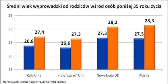 W tym względzie przodują kobiety. Biorąc pod uwagę dane Eurostatu, można szacować, że panie wyprowadzają się od rodziców o 12 miesięcy wcześniej niż mężczyźni. W gronie osób przed 35 rokiem życia Polka opuszcza rodzinny dom przeciętnie w wieku 27,3 lat. W przypadku mężczyzn średni wiek to 28,3 lat. Jest to wynik na poziomie średnim dla krajów „nowej Unii”. Gorzej byłoby, gdyby porównać skłonność do wyprowadzki od rodziców nad Wisłą i w bogatych krajach „starej” Unii. Tam przeciętny wiek usamodzielnienia to 26,6 lat dla pań i 27,3 lat dla panów. Nie należy jednak zapominać, że na lepsze wyniki może mieć wpływ wyższy niż w Polsce poziom dochodów w tych krajach.
