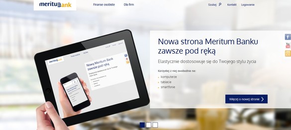 Meritum Bank uruchomił nową stronę internetową. Dzięki zastosowaniu technologii Responsive Web Design serwis dopasowuje się do wielkości ekranu, na którym jest wyświetlany – jest tak samo funkcjonalny na komputerze, smartfonie i tablecie. Bank jako jedyny w branży finansowej umożliwia pozostawienie postów z Facebooka bezpośrednio na swojej stronie.