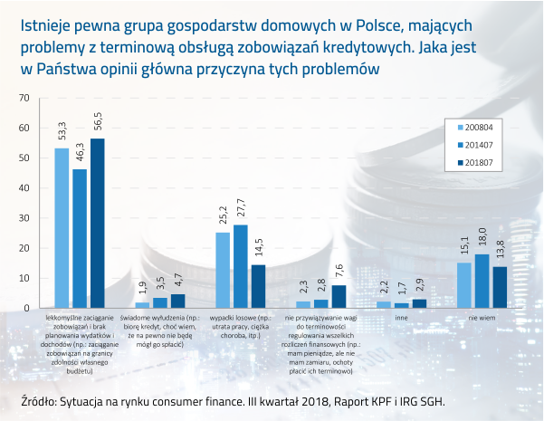 Dane uzyskane w badaniu zdecydowanie zaprzeczają powszechnie panującemu przekonaniu, że przyczyną trudności w wywiązywaniu się ze zobowiązań są w większości przyczyny losowe. W odpowiedzi na pytanie: „Istnieje pewna grupa gospodarstw domowych w Polsce, mających problemy z terminową obsługą zobowiązań kredytowych. Jaka jest w Państwa opinii główna przyczyna tych problemów?”, najczęściej jako przyczynę nieterminowej obsługi długów kredytowych wskazywano lekkomyślność przy ich zaciąganiu oraz brak planowania wydatków i dochodów. Na taki wariant wskazało 56,5% respondentów, co oznacza istotny, bo 20-procentowy wzrost w porównaniu do sytuacji sprzed 4 lat. Wówczas było to 46,3%. W badaniu z 2008 r. była to podobna grupa jak w kwartale bieżącym (53,3%).