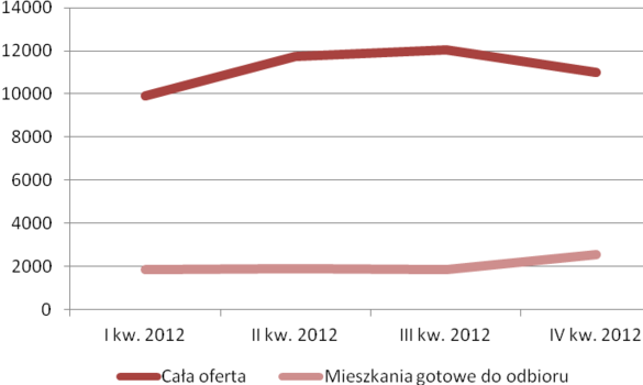 Bardzo szybko rośnie liczba mieszkań gotowych do odbioru, a dodatkowo część inwestorów przesunęła oddanie inwestycji do użytkowania na pierwsze tygodnie 2013 r. W ten sposób klienci poszukując mieszkania mają tak naprawdę dużo większy wybór lokali, które fizycznie mogą obejrzeć, niż wynika to z surowych statystyk mieszkań gotowych. Obecny rok będzie z pewnością stał pod znakiem gotowych mieszkań. Inwestorzy, którzy wprowadzą na rynek nowe projekty będą musieli zaproponować dużo bardziej konkurencyjną ofertę lub też pogodzić się ze znikomą sprzedażą podczas pierwszych etapów prac budowlanych.