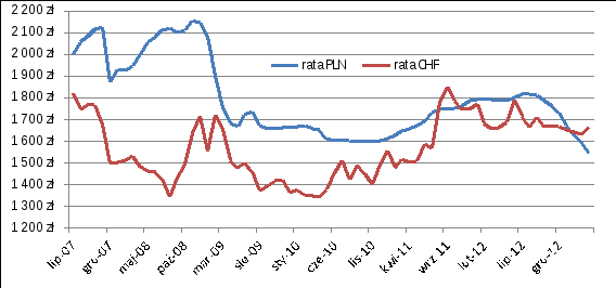Przez ten okres w zdecydowanej większości miesięcy rata kredytu w złotych była wyższa (w wakacje 2008 r., gdy w Polsce były wysokie stopy procentowe, a frank kosztował 2 zł, o rekordowe 60 proc.), ale w ostatnich miesiącach sytuacja uległa zmianie. Obniżki stóp procentowych, których jesienią i zimą dokonała Rada Polityki Pieniężnej, sprawiły, że stawka WIBOR 3M decydująca o oprocentowaniu kredytów hipotecznych w złotych i wysokości ich rat spadła od wakacji 2012 r. o 180 pkt bazowych. W efekcie i miesięczne obciążenie kredytobiorców zaczęło spadać. Kwietniowa rata kredytu w złotych była o 7 proc. niższa od tego we frankach i wyniosła 1545 zł (porównując do 1662 zł dla franka).