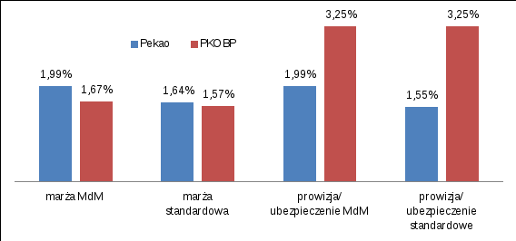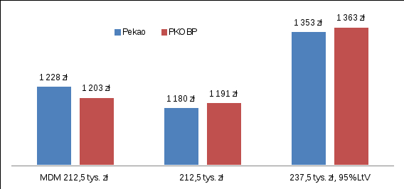 W PKO BP rata dla 237,5 tys. zł na 95 proc. LtV, ze skredytowaną opłatą za ubezpieczenie wyniesie 1363 zł. W Pekao, po skredytowaniu prowizji będzie to 1353 zł. W banku z żubrem marża sięgnie 1,89 p.p. i pozostanie jednak nieco niższa niż dla klientów MdM zadłużających się na 85 proc., czyli mniejszą część nieruchomości.