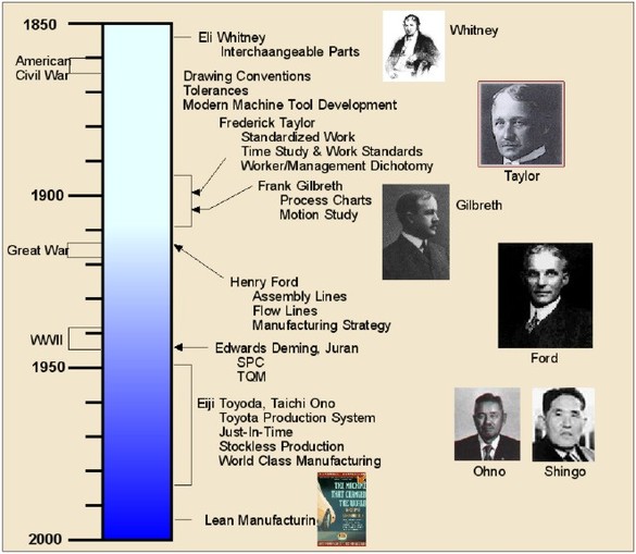 Korzenie Lean Manufacturing sięgają przełomu XIX i XX wieku i postaci Eli Whitneya (ur. 8.12.1765r., zm. 8.01.1825r.), amerykańskiego wynalazcy i przedsiębiorcy. Whitney jest co prawda bardziej znany jako konstruktor odziarniarki bawełny, czyli maszyny do mechanicznego oddzielania nasion od włókien, ale jego najważniejszym pomysłem było wykorzystanie linii montażowej do produkcji masowej. Dość powiedzieć, że pomimo uzyskania w 1794 roku patentu na swoją odziarniarkę, Whitney opuścił Południe i resztę życia poświęcił przeprojektowywaniu fabryk, by dostosowywać je do produkcji masowej.