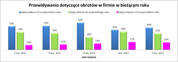 Wyniki najnowszego badania mogą wskazywać, że po dość wyraźnym pogorszeniu nastrojów przedsiębiorców, jakie miało miejsce w I kwartale, II kwartał przyniósł widoczną poprawę. Świadczy o tym wzrost odsetka firm, które w tym roku spodziewają się większych obrotów w swojej firmie, przede wszystkim kosztem osób oczekujących stabilizacji obrotów na poziomie sprzed roku. Warto przy tym zauważać, że udział firm przewidujących spadek tej kategorii niezmiennie utrzymuje się na dość niskim, zaledwie kilkunastoprocentowych poziomie. Mimo poprawy w ujęciu kwartał do kwartału przedsiębiorcy wciąż wykazują jednak mniej optymizmu niż przed rokiem, gdy odsetek firm spodziewających się zarówno wzrostu, jak i stabilizacji obrotów był większy.