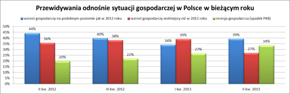 Pewnych trudności jak zwykle przysparza ocena przewidywań mikroprzedsiębiorców odnośnie sytuacji gospodarczej. Najnowsze wyniki wskazują na jednoczesny wzrost odsetka firm spodziewających się wystąpienia w Polsce recesji gospodarczej zdefiniowanej jako spadek PKB oraz odsetka firm spodziewających się, że gospodarka będzie się w tym roku rozwijać szybciej niż w poprzednim. Wyraźnie skurczyła się natomiast grupa przedsiębiorców przewidujących spadek tempa wzrostu PKB, która w poprzednim badaniu była najliczniejsza, a obecnie jest najsłabiej reprezentowana.