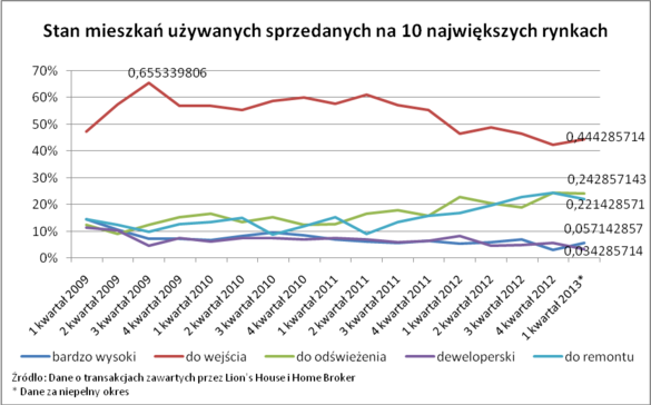 Należy jednak zauważyć, że na przestrzeni ostatnich lat udział w rynku wtórnym takich lokali spada. W 2009 roku (w III kw.) było ich rekordowo dużo, bo mieszkania w stanie „do wejścia” odpowiadały za prawie dwie na trzy transakcje. Wyraźny spadek ich popularności rozpoczął się w III kw. 2011 roku i trwa do dziś.