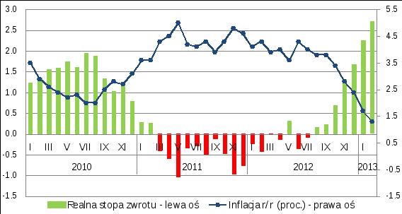 Równolegle ze spadkiem oprocentowania bankowych lokat hamuje także inflacja. Przeciętne stawki na nowych depozytach terminowych są z każdym dniem coraz niższe, ale w zamian rosną zyski z lokat, które się właśnie kończą. Według danych Głównego Urzędu Statystycznego wskaźnik cen towarów i usług konsumpcyjnych był w lutym o 1,3 proc. wyższy niż przed rokiem. Po raz ostatni ceny rosły równie wolno w 2006 r. Kolejne z rzędu obniżenie tempa wzrostu cen spowodowało, że zakładane przed rokiem przeciętne 12-miesięczne depozyty po uwzględnieniu 19-proc. podatku oraz inflacji dały realnie zarobić 2,7 proc. Miesiąc wcześniej rentowność kończących się lokat wynosiła 2,25 proc. Jeszcze w sierpniu i we wrześniu ub.r. ledwo przekraczała ona zero, zaś od marca 2011 r. do lipca ub.r. niemal nieprzerwanie była na ujemnym poziomie.