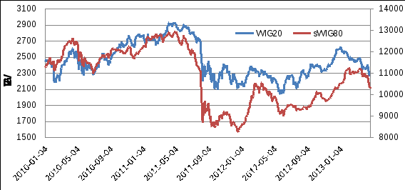 Patrząc na napływające ostatnio coraz liczniej bardzo niekorzystne informacje, dotyczące kondycji i perspektyw naszej gospodarki, można sądzić, że inwestorzy weryfikują swoje nadmiernie optymistyczne założenia. Angażowali wcześniej kapitał w papiery małych i średnich firm, licząc na ponadprzeciętne zyski, w czasie gdy nadejdzie ożywienie gospodarcze. Według powszechnego przekonania i licznych prognoz, miało ono pojawić się najpóźniej w drugiej połowie roku, zaś pierwsze jego sygnały miały być dostrzegalne już po pierwszym kwartale. Sygnały poprawy w gospodarce nie nadeszły, a perspektywa przełamania niekorzystnych tendencji wyraźnie przesuwa się w czasie. Dziś można mieć obawy, że bardziej wyraźne ożywienie będzie miało miejsce raczej dopiero w ostatnich miesiącach tego roku lub nawet w pierwszym kwartale 2014 r.