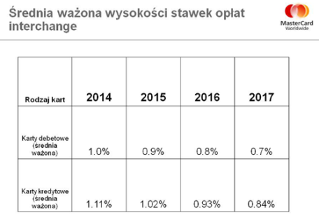 Jednocześnie przewidziano ograniczenie maksymalnego poziomu stawki. Granica ta będzie zależna od średniej ważonej w poszczególnych kategoriach i wyniesie 25 pb. ponad średnią dla kart debetowych, a 40 pb. dla kredytowych.