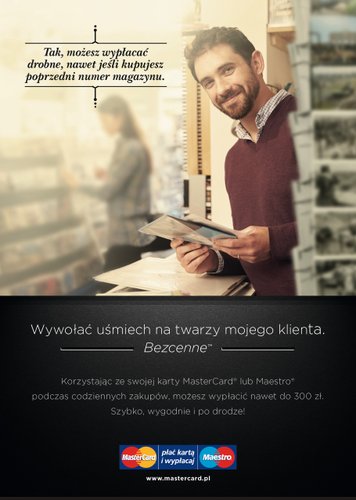 Rusza nowa kampania reklamowa MasterCard promująca usługę Płać kartą i wypłacaj, dzięki której można wypłacić gotówkę z kasy sklepu przy płaceniu kartą za zakupy. Dane NBP wskazują, że popularność tej usługi wśród Polaków dynamicznie rośnie. Przynosi ona zalety zarówno konsumentom, którzy mogą ją potraktować jako opcję uzupełniającą korzystanie z bankomatu, jak i sklepom, które mogą przyciągnąć nowych klientów, oferując im dodatkową usługę.