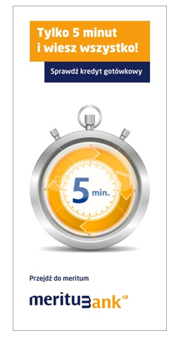 Meritum Bank wprowadza nowe zasady udzielania kredytów gotówkowych w placówkach i gwarantuje, że podejmie wstępną decyzję kredytową w 5 minut. Jeśli będzie ona pozytywna, ale jej wydanie zajmie więcej czasu, Bank wypłaci klientowi 100 zł rekompensaty.