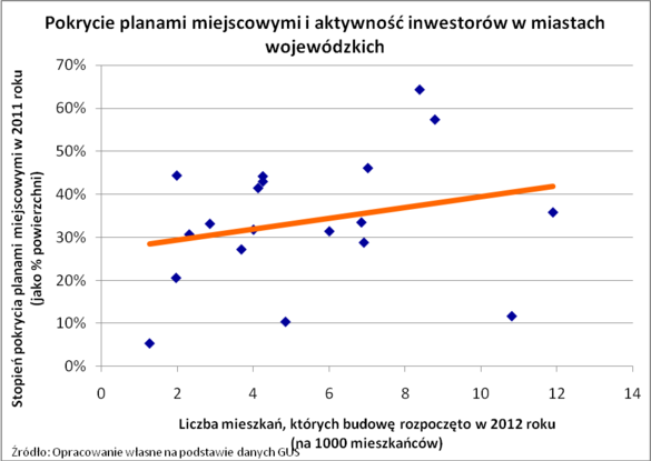 Gminy tworząc plany miejscowe ponoszą wymierne koszty, ale nie bez korzyści w przyszłości. Jedną z nich jest pobudzenie inwestycji na danym terenie. Deweloperzy kupując działkę, która jest objęta planem miejscowym ponoszą mniejsze ryzyko tego, że założonego projektu nie uda im się na danym terenie zrealizować. Ponadto przed uzyskaniem pozwolenia na budowę nie muszą oni przechodzić trwającej nawet rok procedury uzyskiwania warunków zabudowy, tylko wystarczy uzyskać wypis i wyrys z planu miejscowego co zająć może zaledwie jeden dzień. Nie bez kozery w badaniu przygotowanym przez Home Broker deweloperzy wskazali administracyjne trudności związane z uzyskiwaniem pozwolenia na budowę na drugim miejscu (na 22) wśród barier prowadzonej działalności. Problem ten nie dotyczy jednak tylko deweloperów, ale też spółdzielni mieszkaniowych czy inwestorów indywidualnych (osób fizycznych). Dane o pokryciu planami miejscowymi na terenach miast wojewódzkich za 2011 rok i liczbie mieszkań, których budowę rozpoczęto w roku kolejnym potwierdzają, że im bardziej kompleksowe planowanie przestrzenne, tym większa aktywność inwestorów (mierzona liczbą rozpoczętych budów na 1000 mieszkańców). Taka informacja cieszyć powinna gminy, ponieważ więcej budynków mieszkalnych, to większe przychody gmin z podatków od nieruchomości i potencjalnie większy udział w dochodach z podatków centralnych (PIT i CIT) pobieranych od mieszkańców powstałych nieruchomości.
